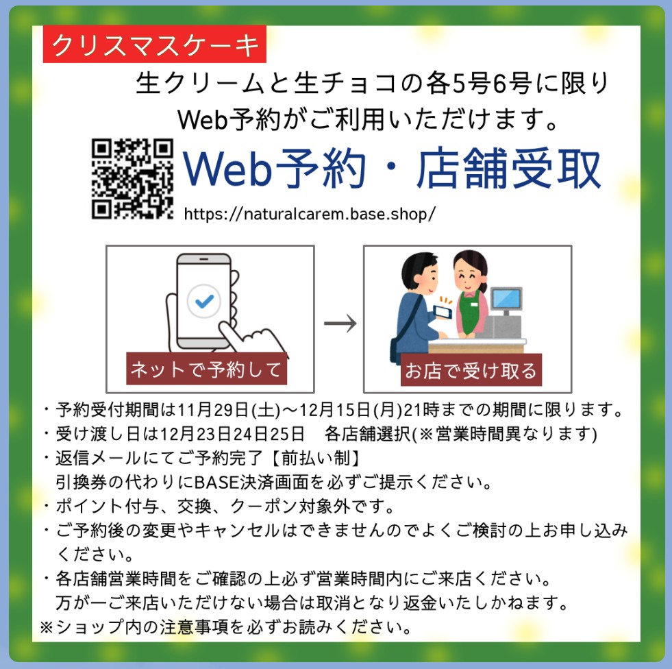 今日から12月。クリスマスケーキのご予約締切は12月15日(月)です。ご予約は受取希望店舗にて前払い制ですが、ご来店が難しいお客様のために種類限定でネットショップからの予約受付が11月29日よりスタートしました。※受取は店頭となります。商品や受取日の変更、キャンセルなどはできませんのでよくご検討のうえご予約ください。