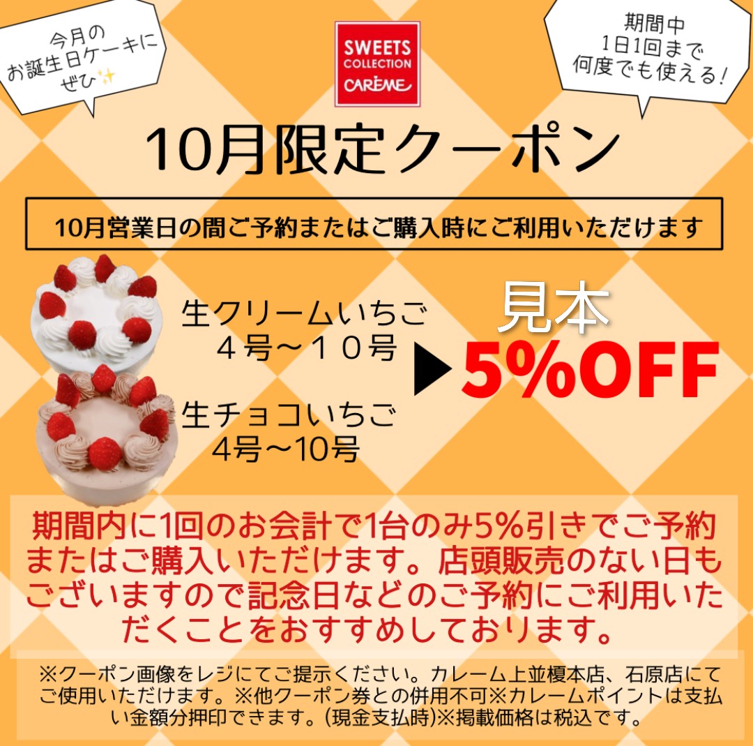 お誕生日や記念日にカレームのデコレーションケーキはいかがでしょうか。LINEのお友達登録で使えるクーポンもございます。今月の対象商品は生クリームのデコレーションと生チョコのデコレーション。ぜひご利用ください。